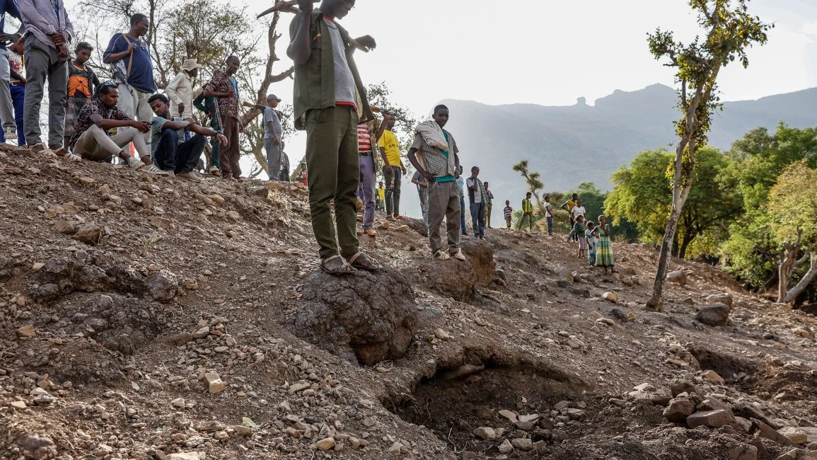 A man stands above a partially excavated mass grave with the remains of individuals murdered by the TPLF in the town of Adi Selam on 7 April 2022 in Welkait, Ethiopia. [Getty]
